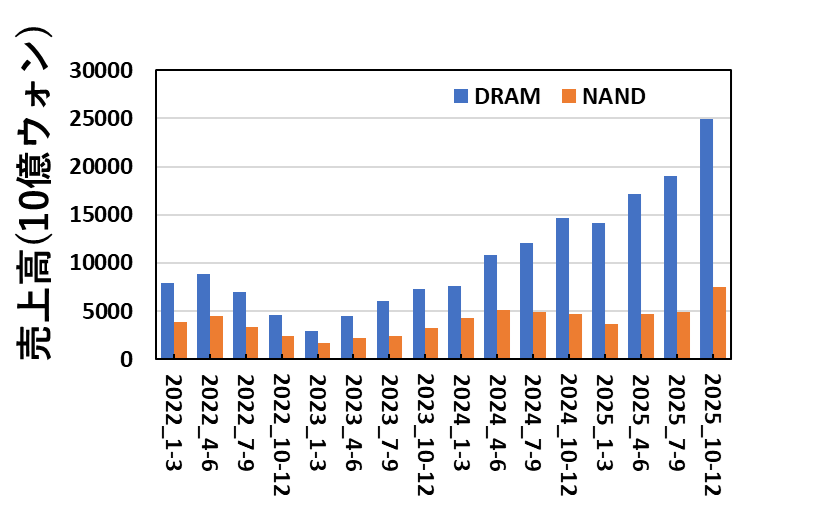 SK Hynixは、DRAM・NAND別の売上高も公表しているので、四半期ごとに図にするとこのようになります。