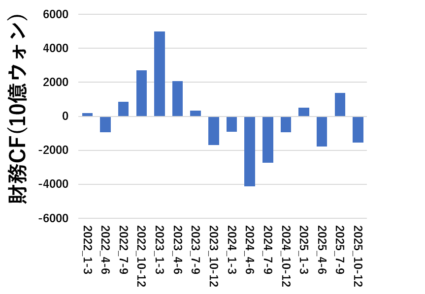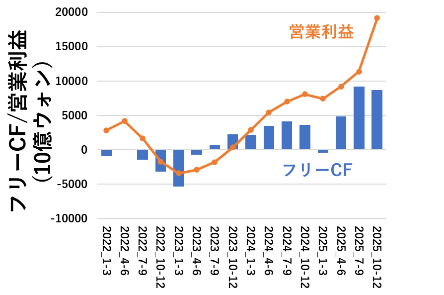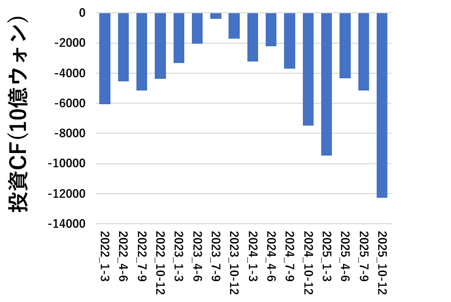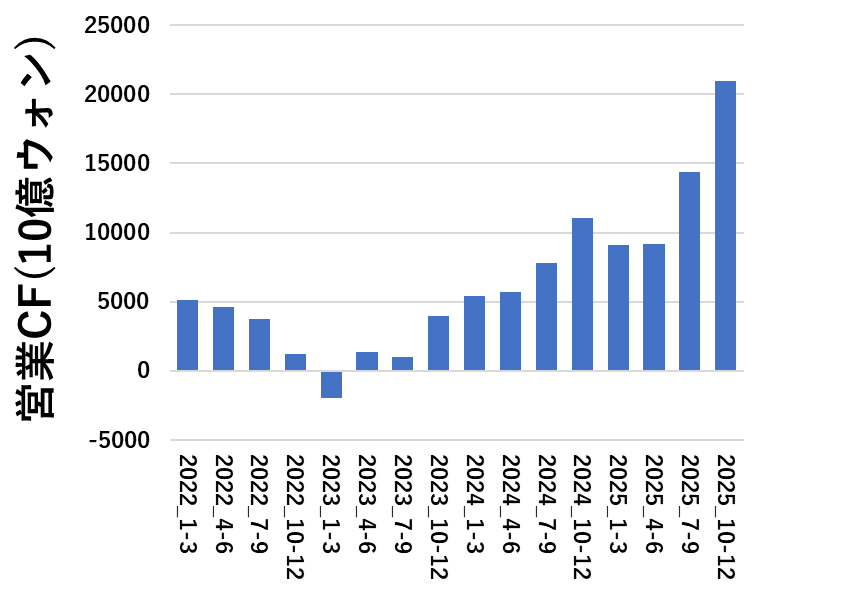 売上高の増加に伴って、営業キャッシュフローは順調に増えています。四半期で20兆ウォンの営業CFは、驚異的としか言えないです・・・